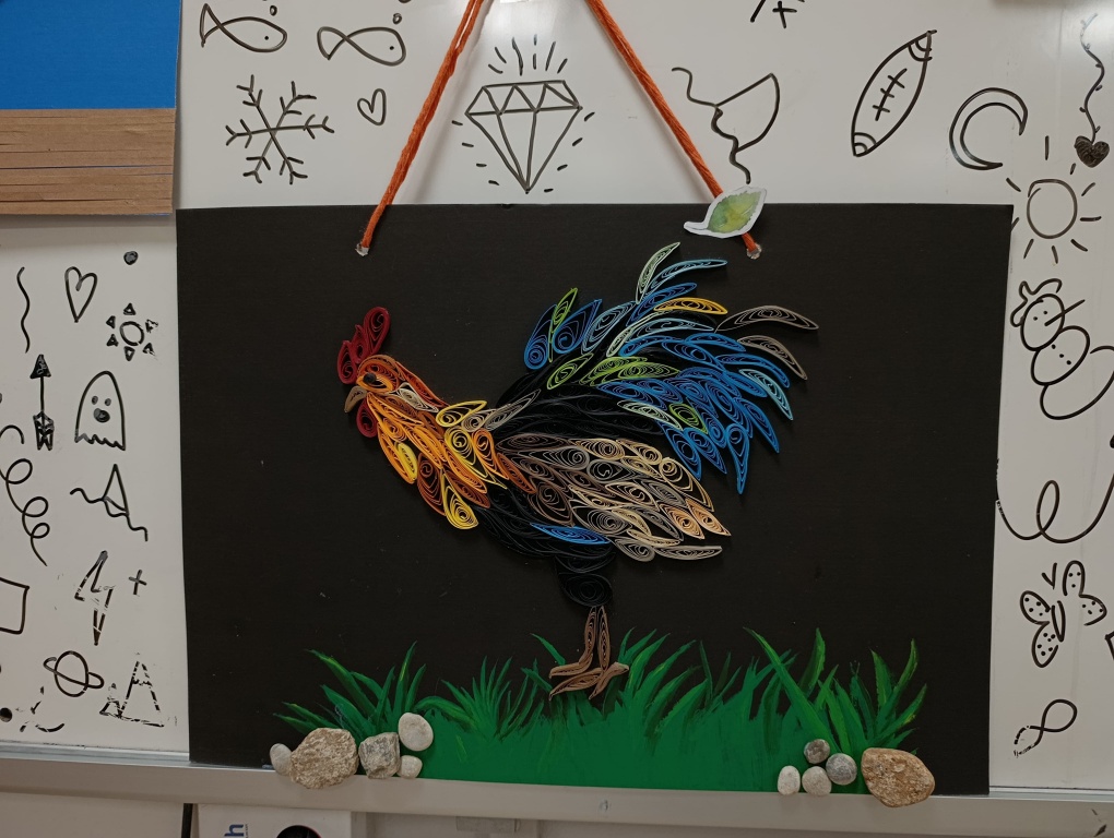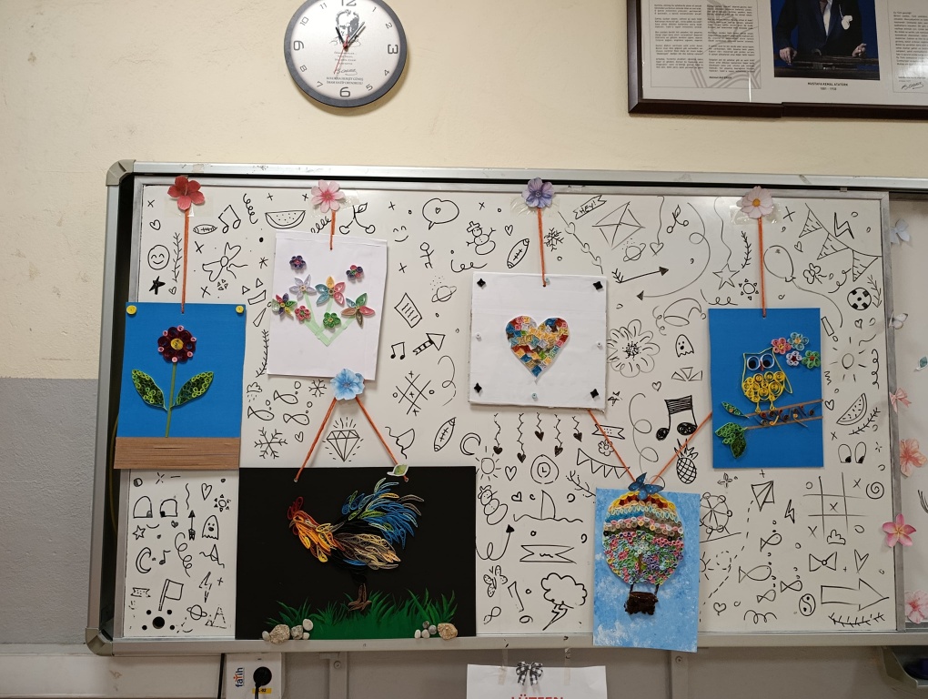 Türkçe öğretmenimiz Habibe AKTAŞ'ın emekleri ile öğrencilerimize sunmaya çalıştığımız bir diğer etkinlik de kağıt telkari sanatı. Malzeme temini kolay, öğrencilerin el becerisi ve hayal gücü açısından çok faydalı olan bu etkinlik sonrasında görsel olarak çok etkileyici ürünler ortaya çıkıyor.